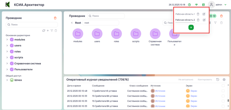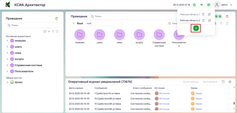 Для добавления новой рабочей области нажать на кнопку Добавить.