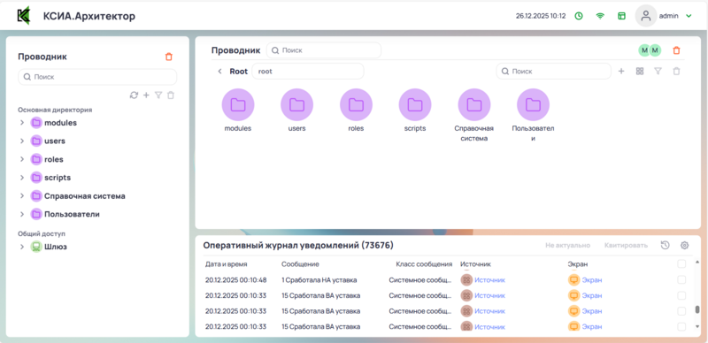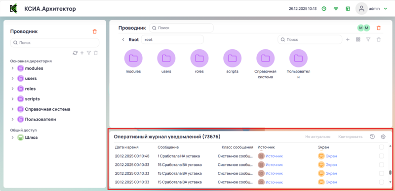 Централизованная хронологическая лента всех системных событий, сообщений и уведомлений сгенерированных программой в реальном времени.