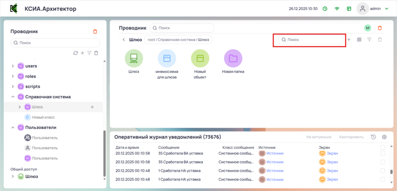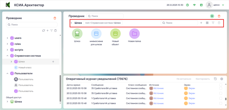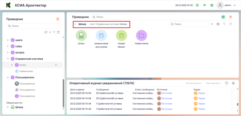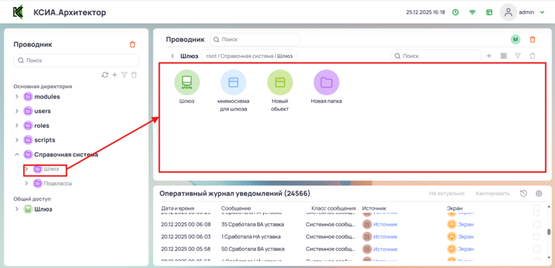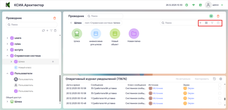 Вызов контекстного меню для выполнения действий в Папке (создание папок или классов и т.д) |