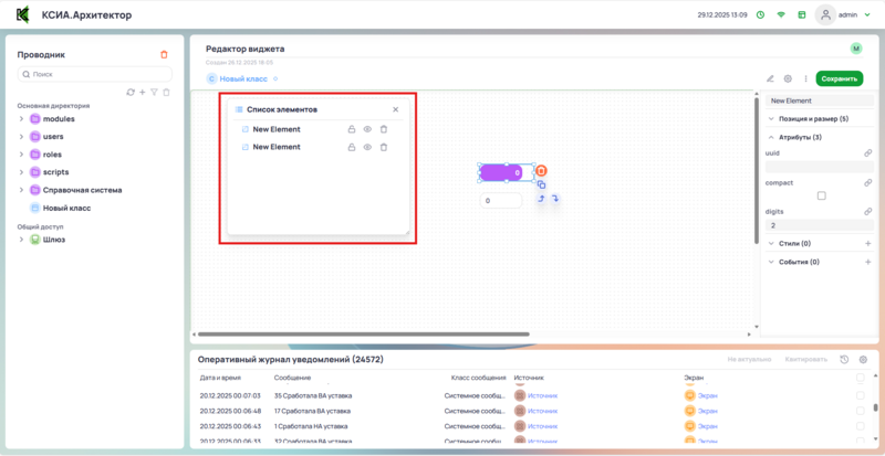 Для добавления списка на полотно необходимо вызвать меню списка компонентов и нажать на необходимый список левой клавишей мыши.