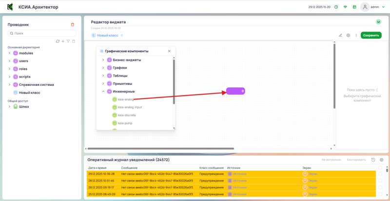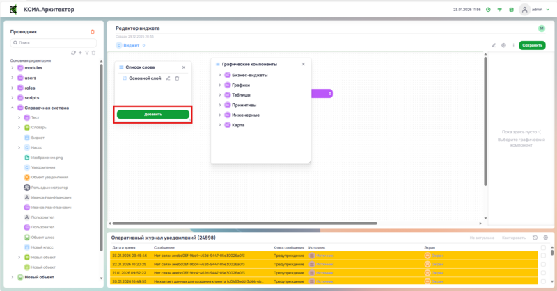 Добавление компонентов в рабочую область осуществляется путём перетаскивания их из интерактивного списка.