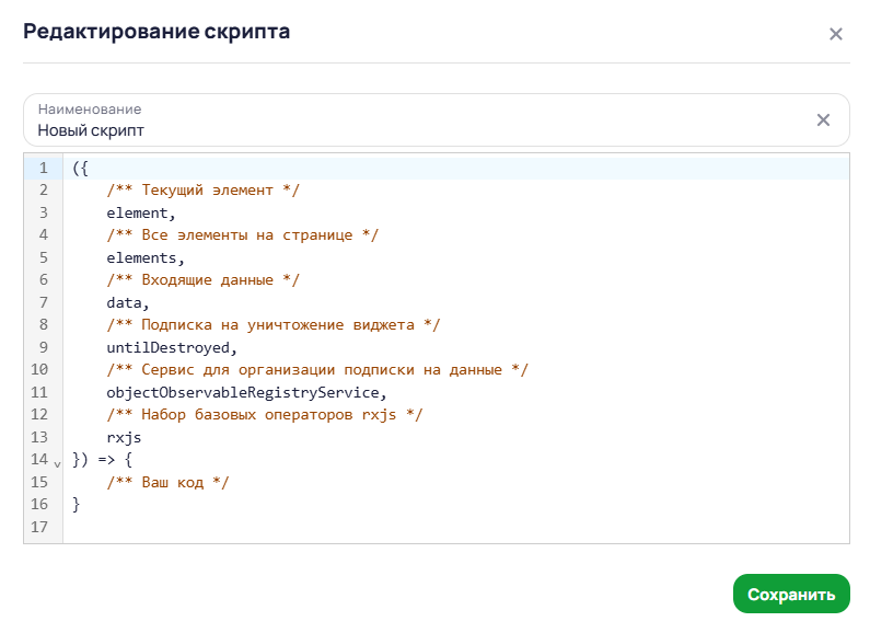При нажатии кнопки Редактирование скрипта откроется для окно для ввода программного кода на JavaScript. После внесение всех изменений нажать кнопку Сохранить.
