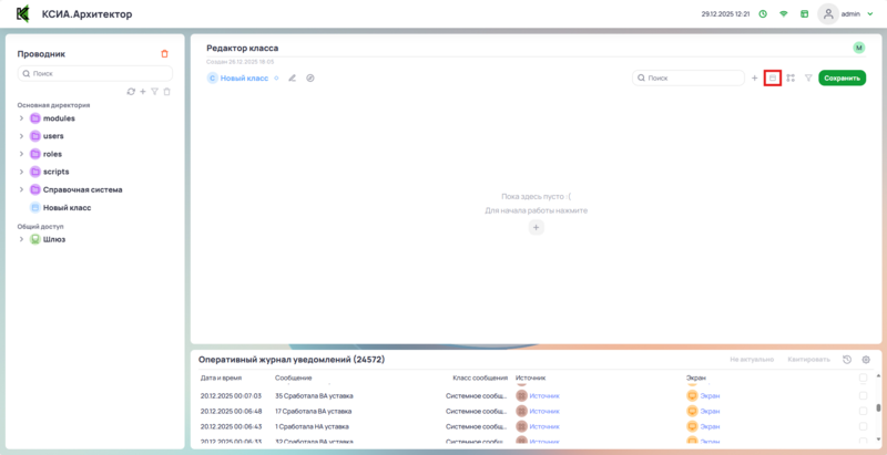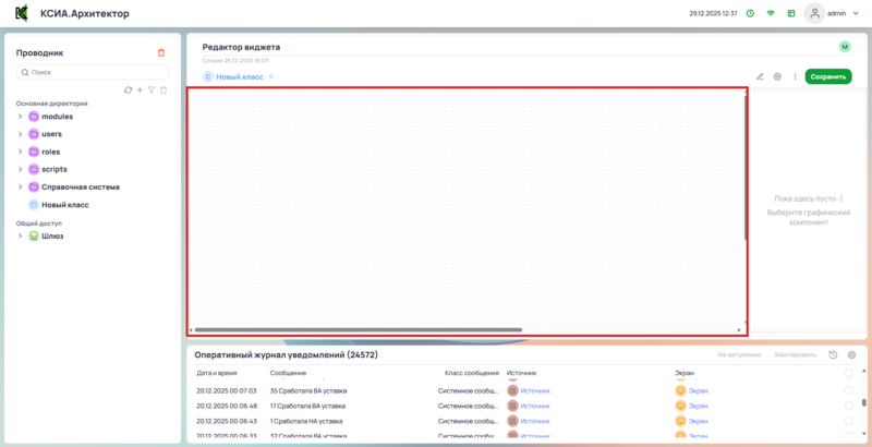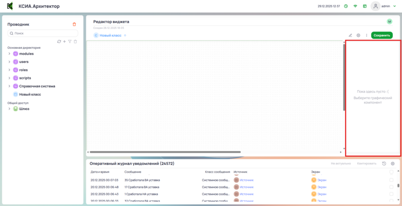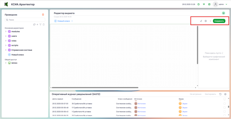 Редактор класса виджета отличается от редактора класса наличием кнопки на панели инструментов для перехода в редактор виджета.