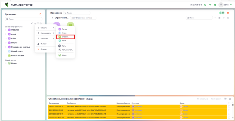 Создание объекта словаря происходит через контекстное меню в проводнике или папке. При вызове контекстного меню выбрать Создать, затем выбрать Словарь.