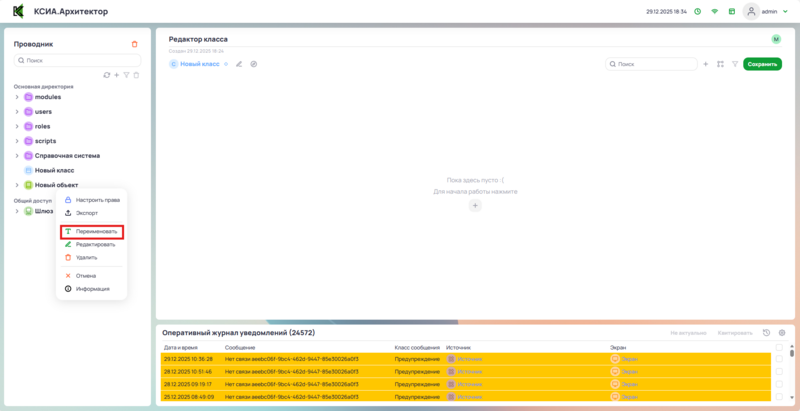 Чтобы переименовать объект необходимо нажать на него правой кнопкой мыши для вызова контекстного меню и выбрать Переименовать.