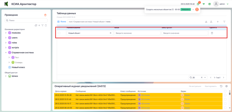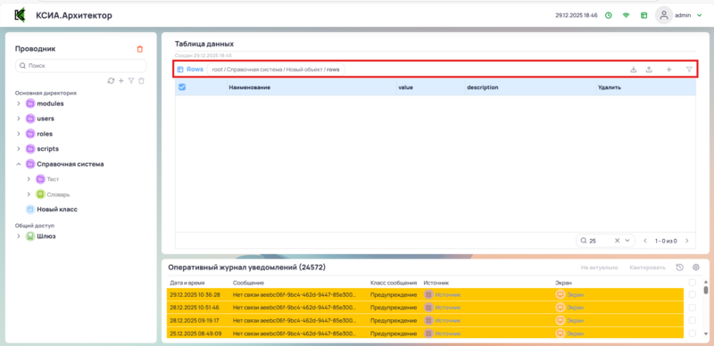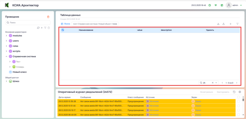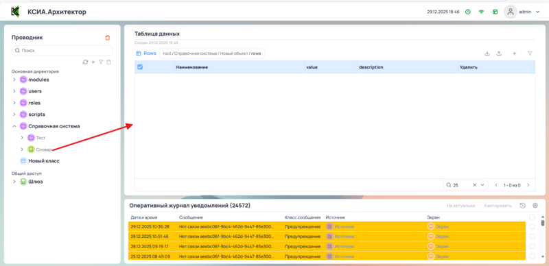 В рабочей области отображена таблица со списком объектов словаря.