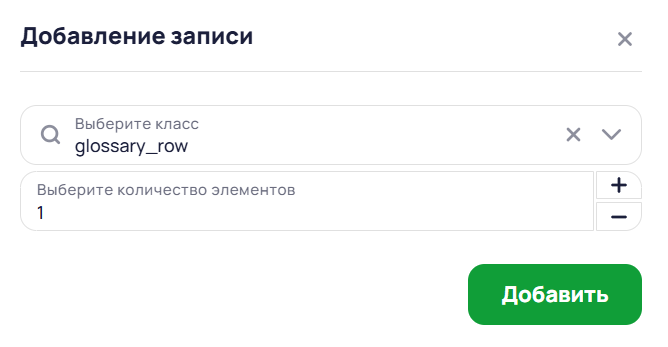 Для добавления нового объекта нажать на кнопку Добавление нового объекта словаря. В появившемся окне выбрать класс (По-умолчанию: Glossary_row), ввести количество элементов, нажать кнопку Добавить.