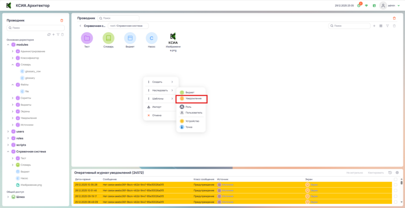 Создание собственного класса уведомления происходит путём наследования от встроенного класса виджета, при вызове контекстного меню выбрать Наследовать, затем выбрать Уведомление.