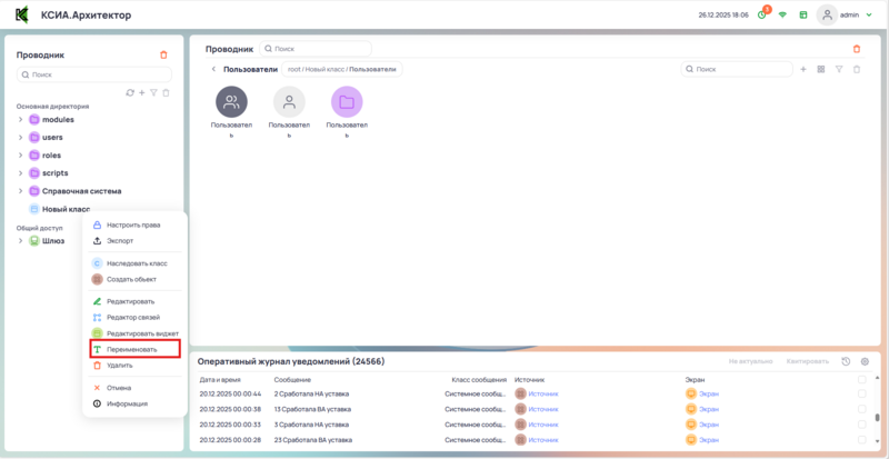 Чтобы переименовать класс необходимо нажать на класс правой кнопкой мыши для вызова контекстного меню и выбрать Переименовать.