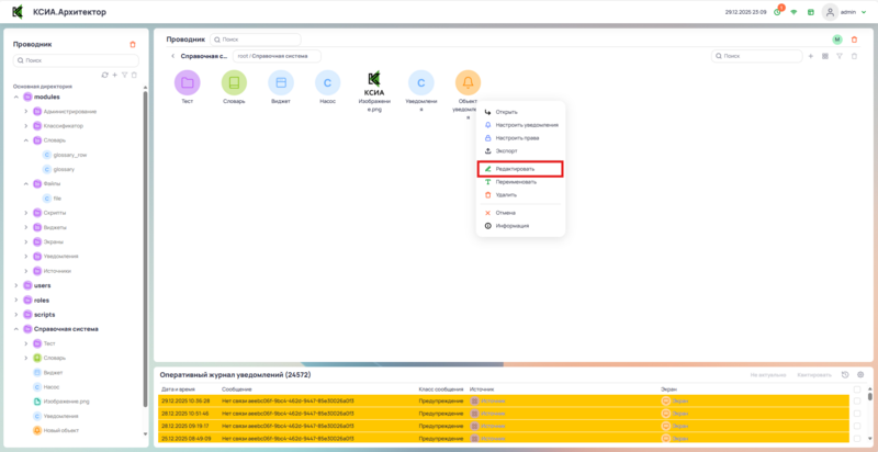 Редактирование уведомления как и редактирование объекта класса происходит в Редакторе объекта.