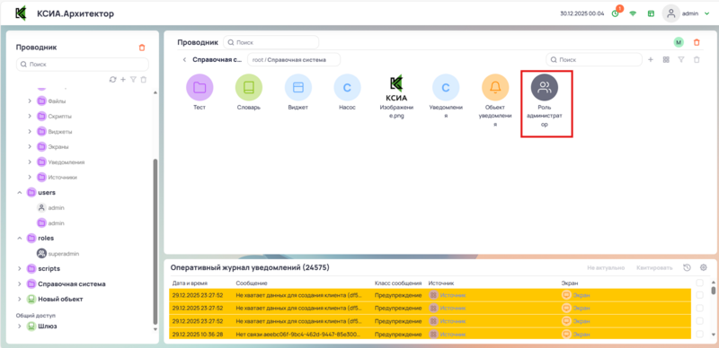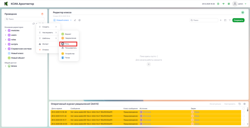 Создание объекта роли происходит через контекстное меню в проводнике или папке. При вызове контекстного меню выбрать Создать, затем выбрать Роль.