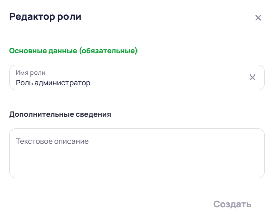 После создания появится окно Редактор роли. В это окне необходимо ввести Имя роли и Дополнительные сведения (при необходимости), после ввода нажать кнопку Создать.
