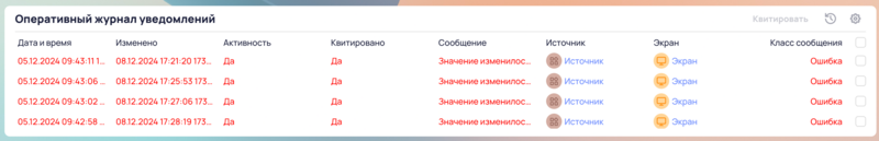 Оперативный журнал расположен в нижней части главного экрана и отображается в виде таблицы.