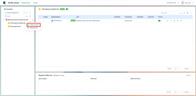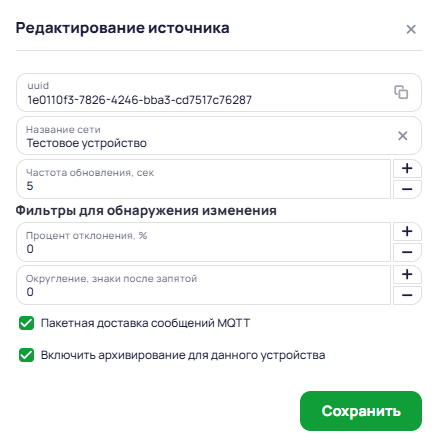 Для редактирования параметров устройства данных нажать правой клавишей мыши на источник и выбрать Редактировать.