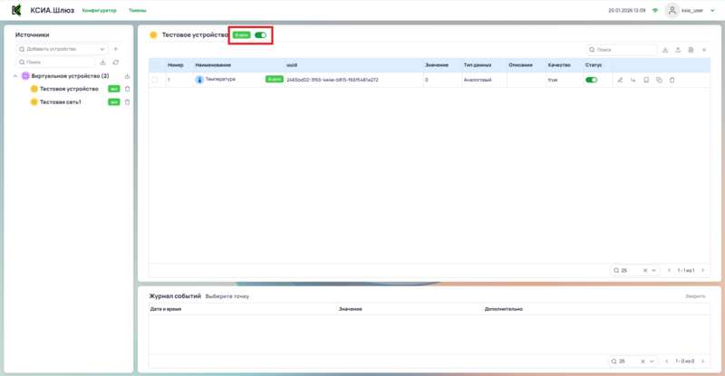 Рядом с названием устройства располагается индикатор состояния устройства и переключатель с возможностью включить/выключить устройство в системе КСИА.Шлюз.