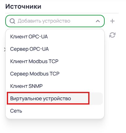 В правой части окна в блоке Источники в строке Добавить источники раскройте список и выберите Виртуальное устройство.