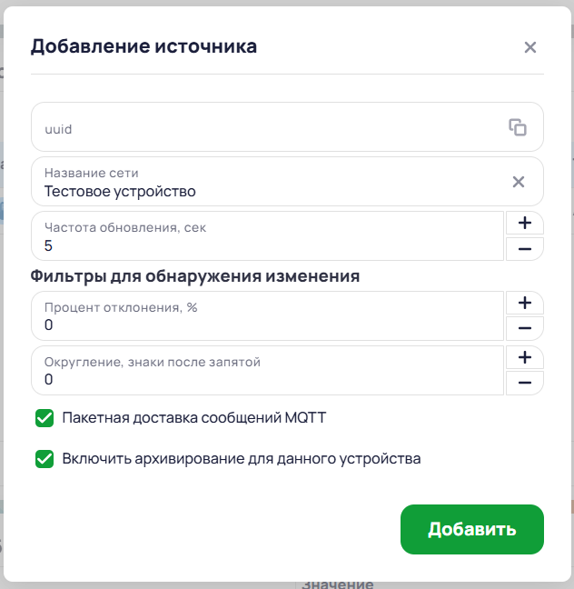 Поверх главного окна отобразилось окно Добавление источника. В этом окне введите название сети Тестовое устройство и нажмите кнопку Добавить.